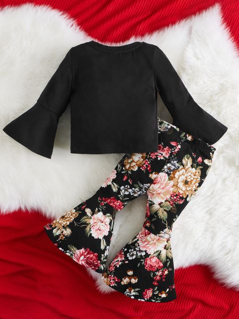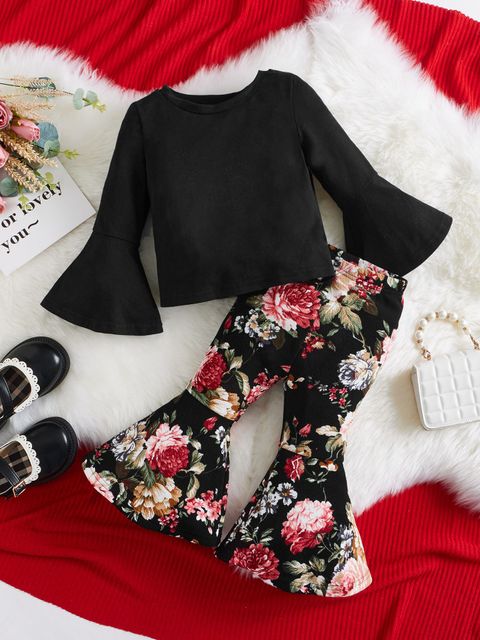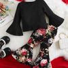 SheinSHEIN تي شيرت بأكمام مكشكشة وسراويل ساق مضيئة بنقشة زهور
