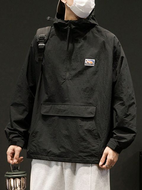 Sheinسترة بغطاء للرأس بجيب بغطاء قلاب وتفاصيل مرقّعة للرجال بنصف سحاب