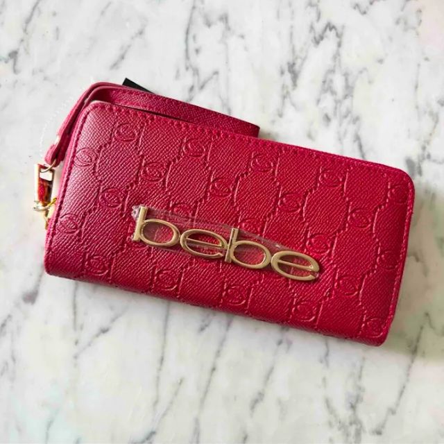 • synthetic upper textured faux-leather large gold-toned bebe logo on front zip-around closure fabric lined interior