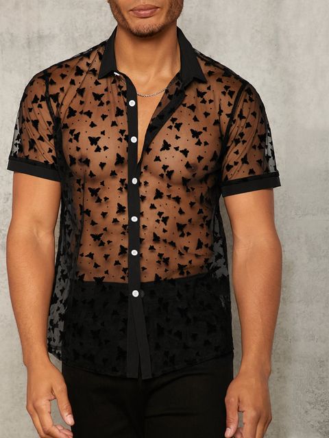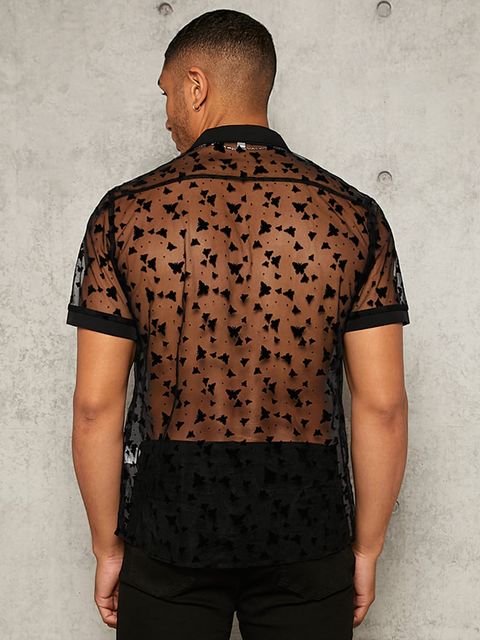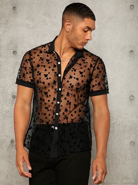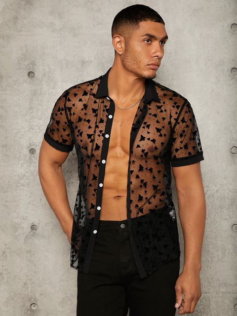 Men Butterfly Print Sheer Mesh Shirt