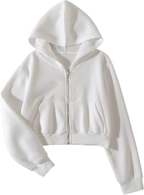 - Classic solid color, hooded neckline, regular fit, full zip front, drop shoulder, cropped hoodie, front pockets, long sleeve