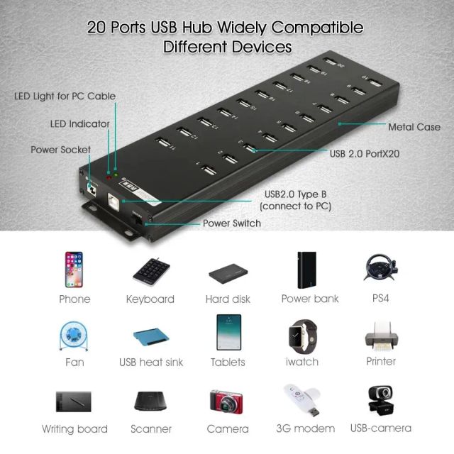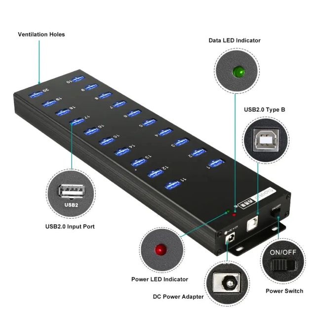 Sipolar 20 Port USB 2.0 Hub 20 Charger and Syncs Port with 12V 8A Desktop Power Adapter A-805