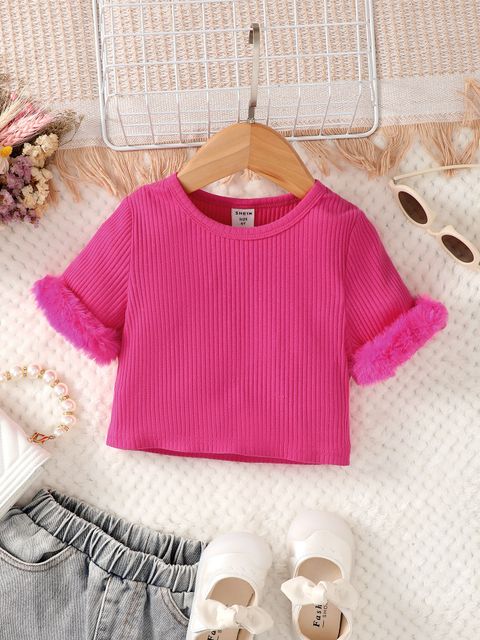 SheinToddler Girls Contrast Fuzzy Cuff Tee
