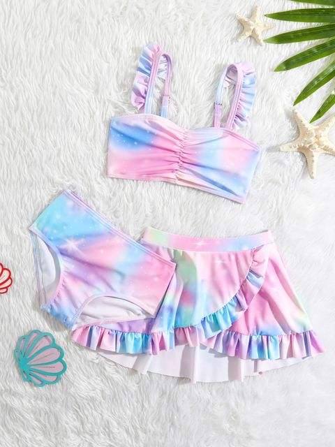 SheinBaby Tie Dye Ruched Ruffle Trim Bikini Swimsuit With Beach Skirt