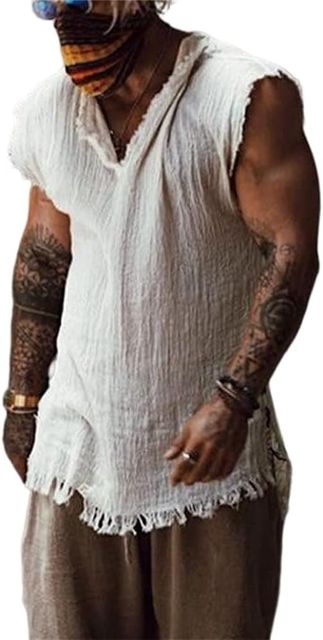 - Features: Cotton linen men's Tank top, V-neck, sleeveless, solid color, raw edge.